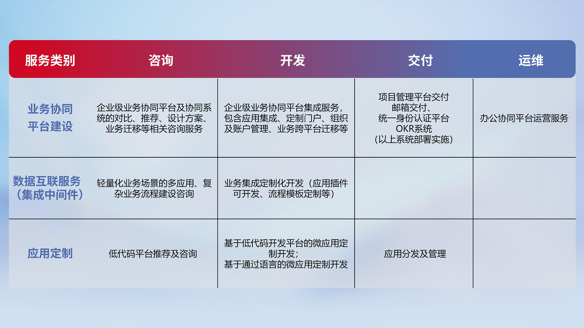 针对钉钉、、、企微、、、、IDaas等平台级产品提供产品的规划、、、方案、、、交付、、、定制化开发等服务,,实现如统一协同办公、、、智能客户服务、、、混合会议管理、、、、智能数据查询、、、、等业务场景,,实现数字化转型。。。。