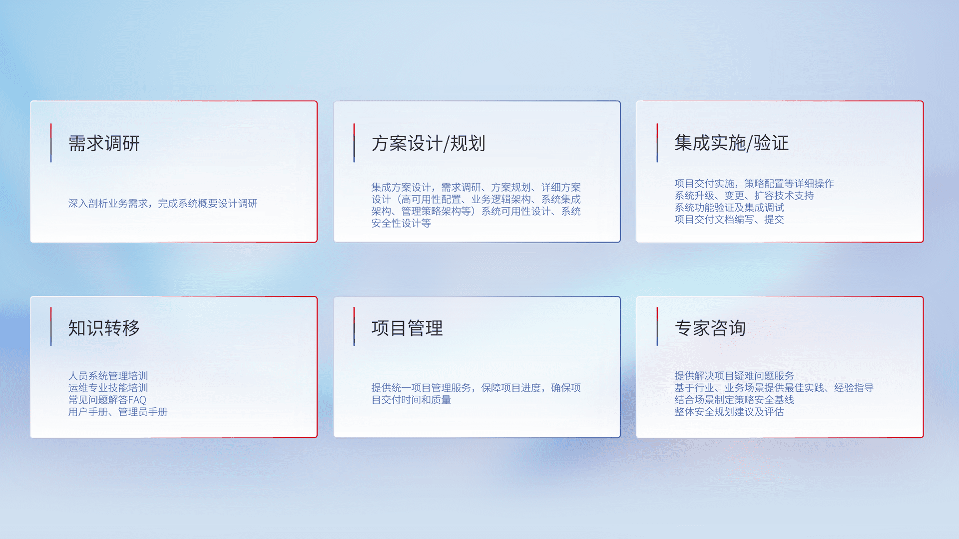 针对客户行业特性,,,将宏观的安全战略和需求,,,通过专业的交付服务,,,,实现项目落地,,,为客户提供标准规范的集成交付服务。。。。